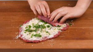 - With each piece of meat, sprinkle the cheese, the parsley, the bread crumbs, garlic, a pinch of salt and pepper.