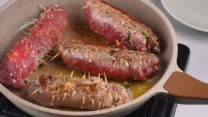 - Cover the bottom of a skillet with olive oil and fry the braciole till cooked.