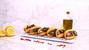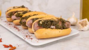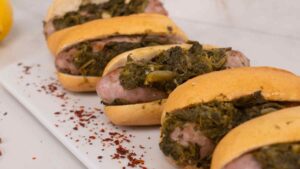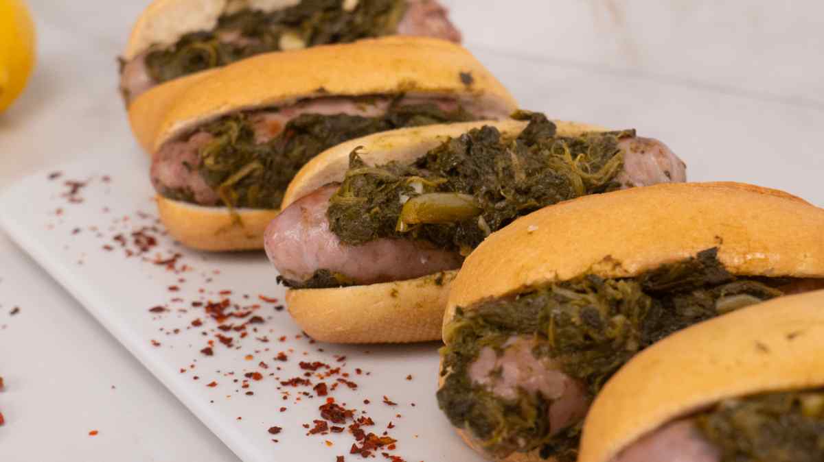 Broccoli rabe and sausage is a dish that combines savory Italian sausage with the slightly bitter, taste of broccoli rabe. This dish is quick and easy to make in a pinch. You can slice the sausage into quarter rounds to cook even faster.