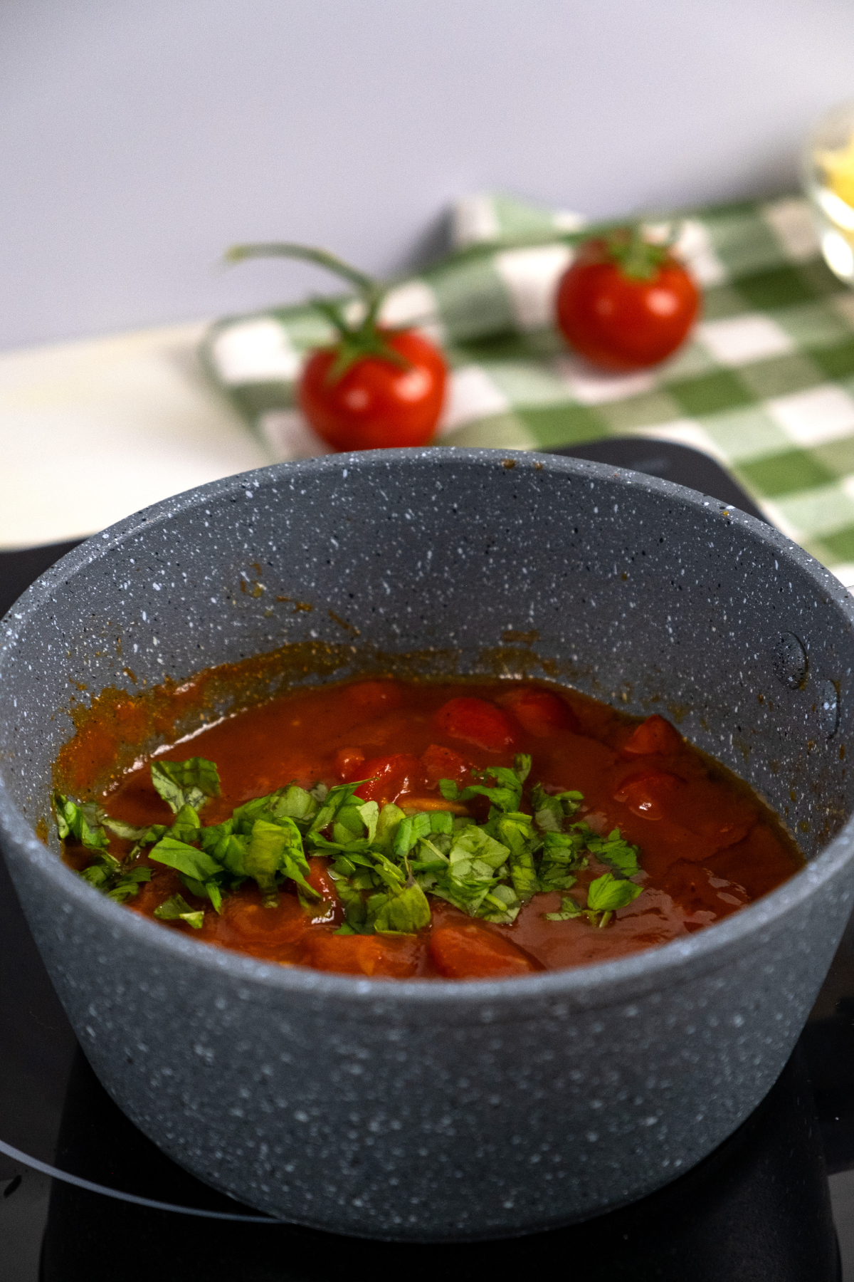 - Shut heat and add, 2 cans crushed tomatoes, 1 can tomato paste, white wine, and sugar. Stir and simmer for several minutes.