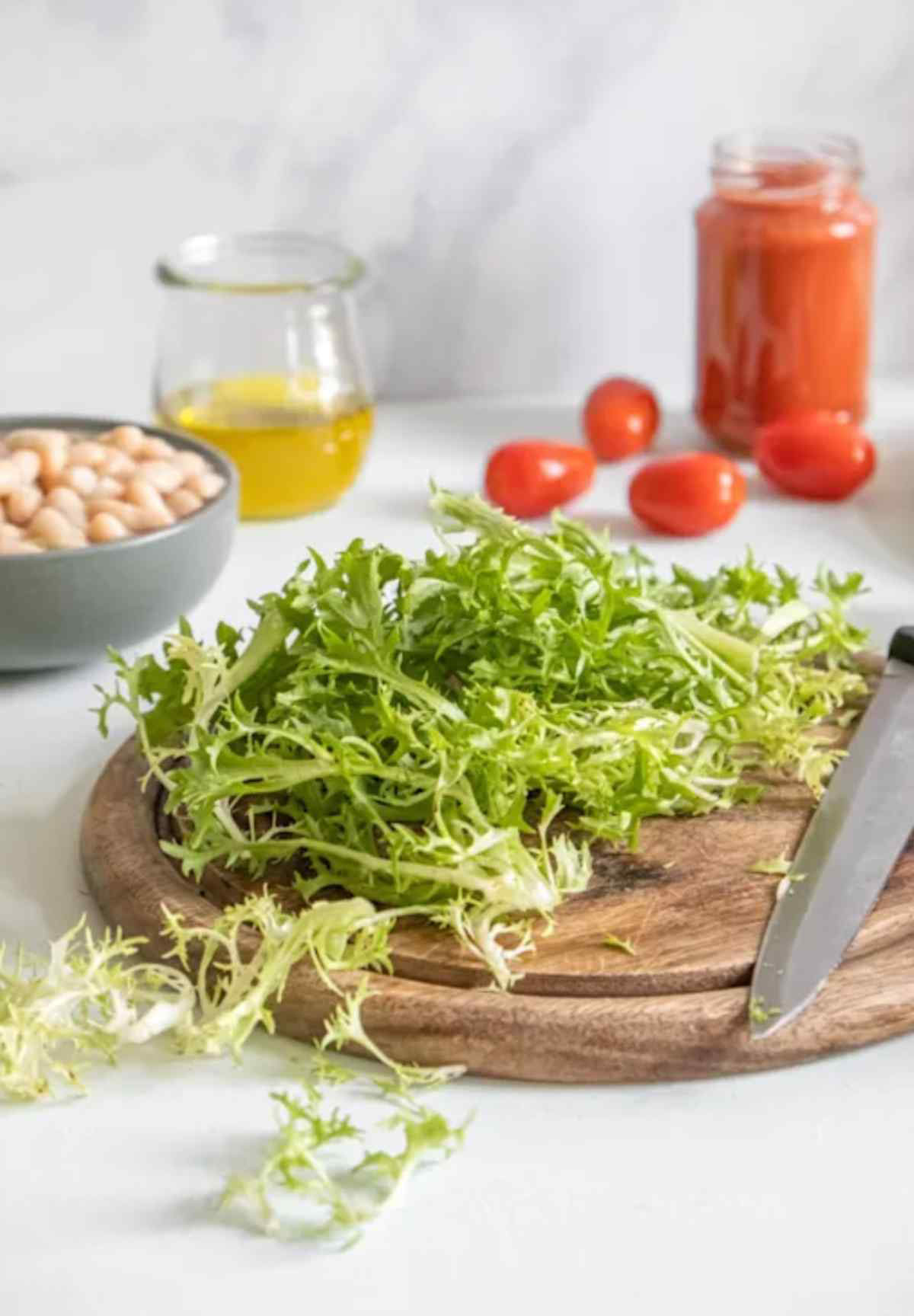 1 Cut the bottom part of the escarole bunch off. Clean escarole in water, removing all the dirt and sand from leaves.