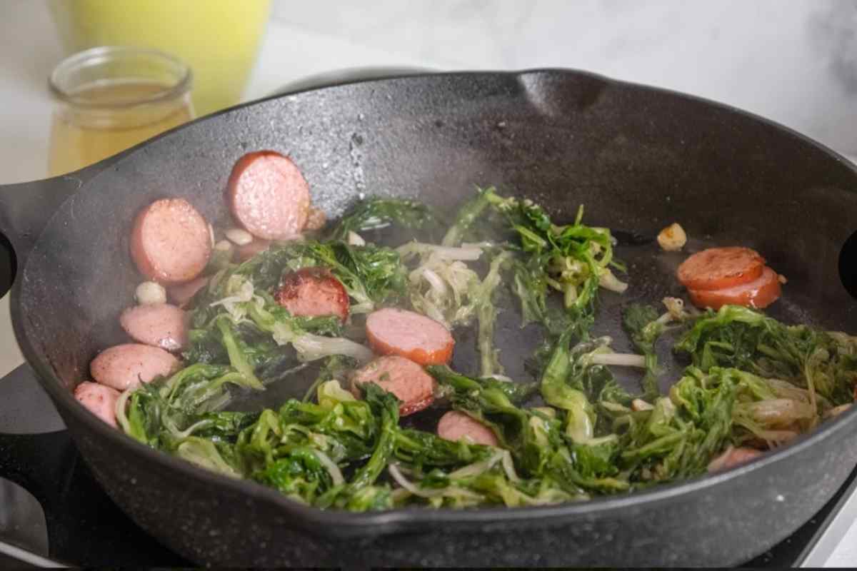 4 Drain the escarole and add to the sautéd sausage. Mix well. Add 2 cans cannellini beans with the liquid, hunts tomato sauce, white wine, chicken bouillon cubes and broth. Mix well.