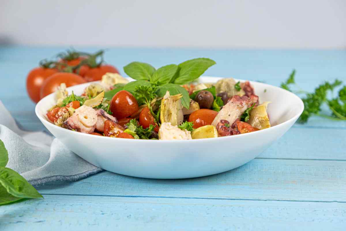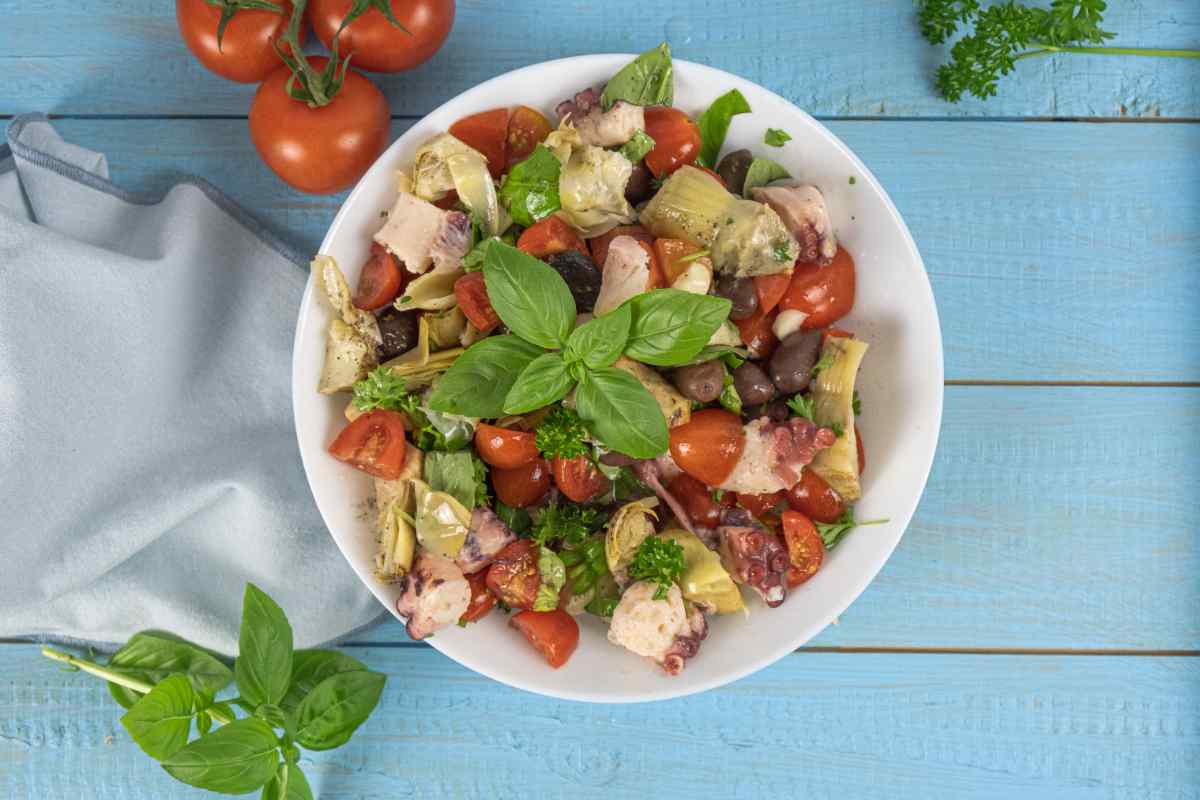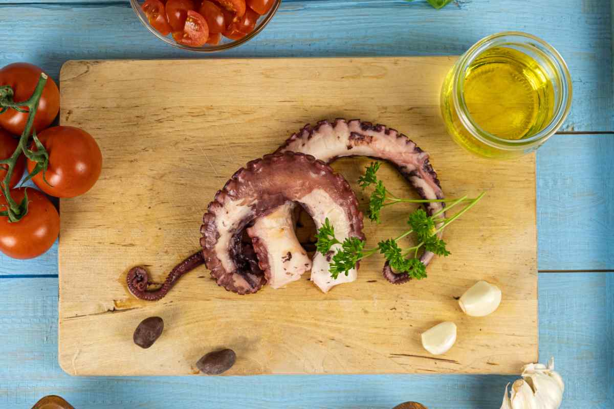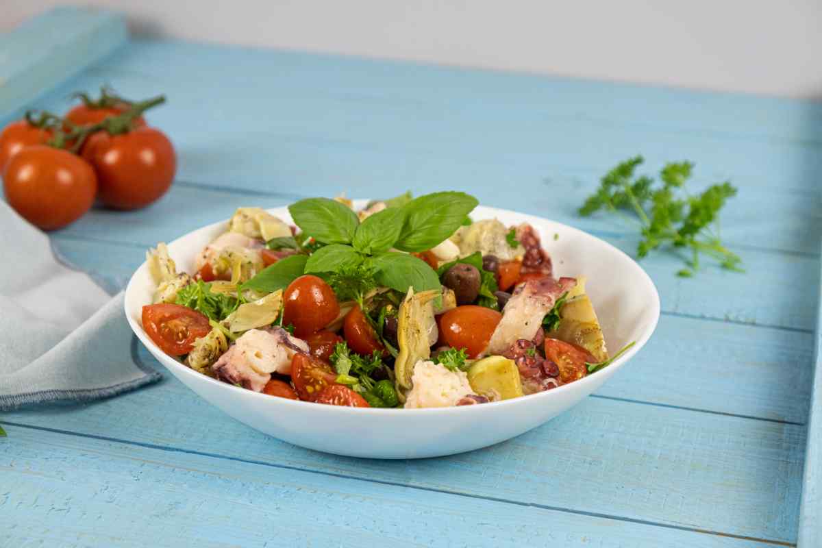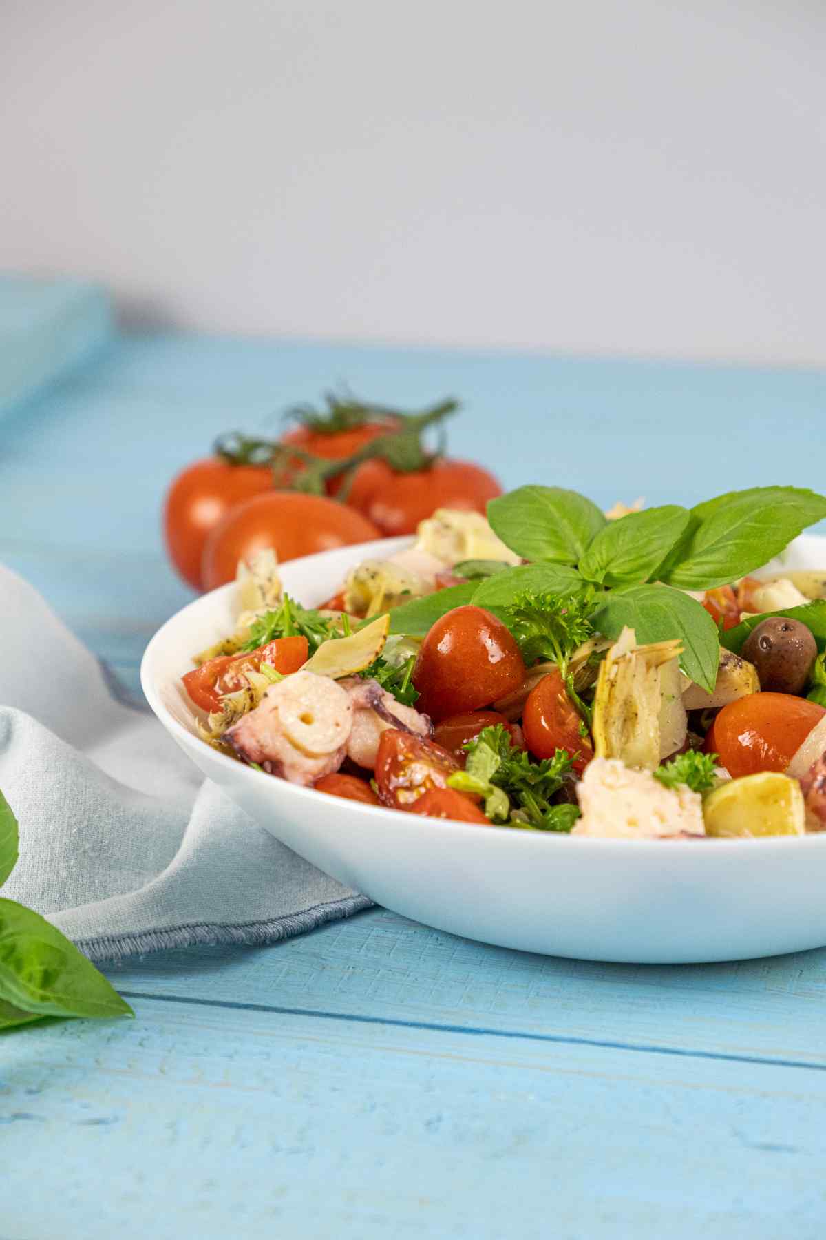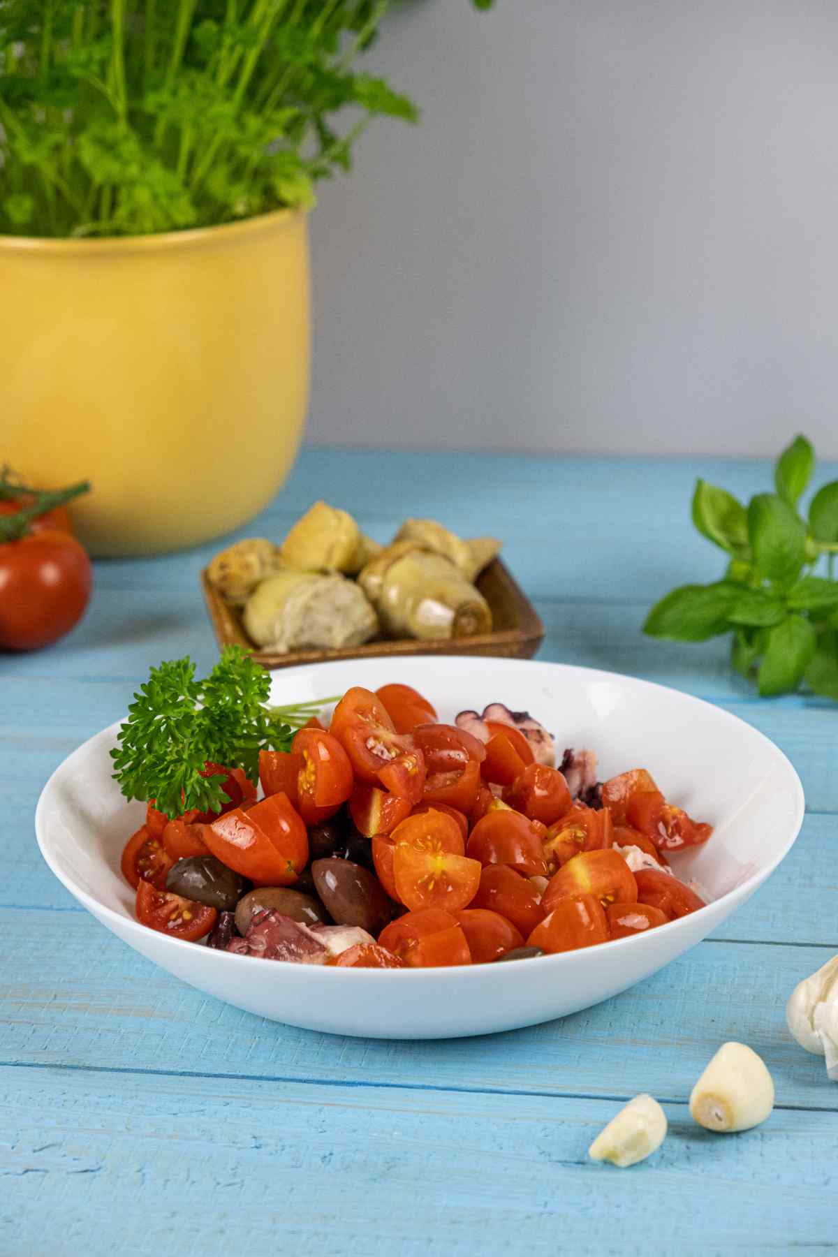 You can boil the octopus to tenderize it before grilling. This is a great summer dish! Full of color and flavor. You can add a multitude of cooked or raw  vegetables to change it up like  fresh string beans or  zucchini or squash.  Serve it as a starter, a side dish or main dish. Compliment with a glass of wine.