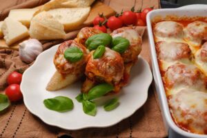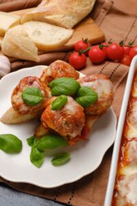 This is a great way to serve meatballs. The warm melted mozzarella brings this dish to the next level. Serve as a hero or alone with spaghetti and a side salad.