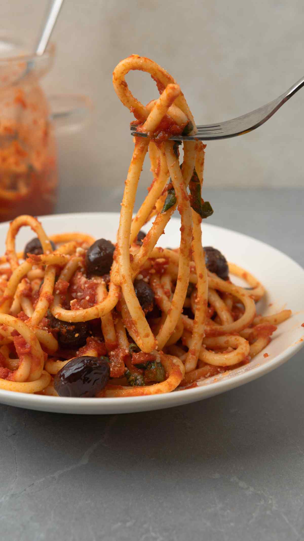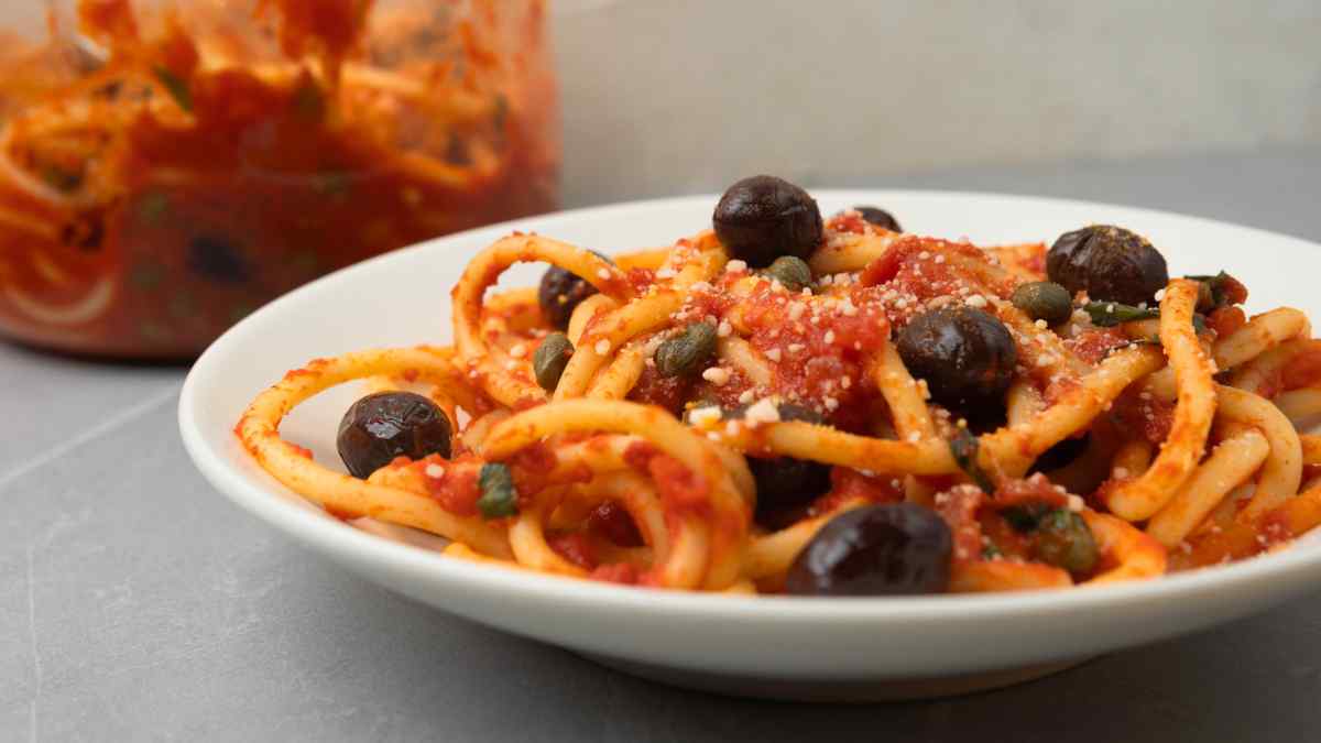 This is a rich and flavorful pasta dish featuring anchovies, kalamata olives and capers.