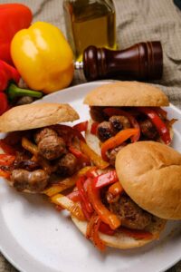 The richness of the sausage blends so well with the sweet and tender flavors of the sautéed peppers and onions. This dish not only tastes delicious but it looks so beautiful with the vibrant colors of the peppers. This colorful dish serves up well as a hot sandwich for lunch or dinner or just on a plate . (See our recipe as a main dish)