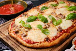 The pizza is great for Friday night dinners or get togethers. The savory flavors from the sausage blends well with the mozzarella cheese and the tomato sauce.