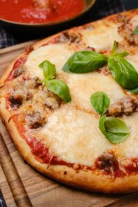 8. Remove from oven and generously spread pizza sauce all over crust, add fresh mozzarella, the crumbled sausage, sprinkle grated cheese and top with basil.