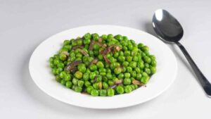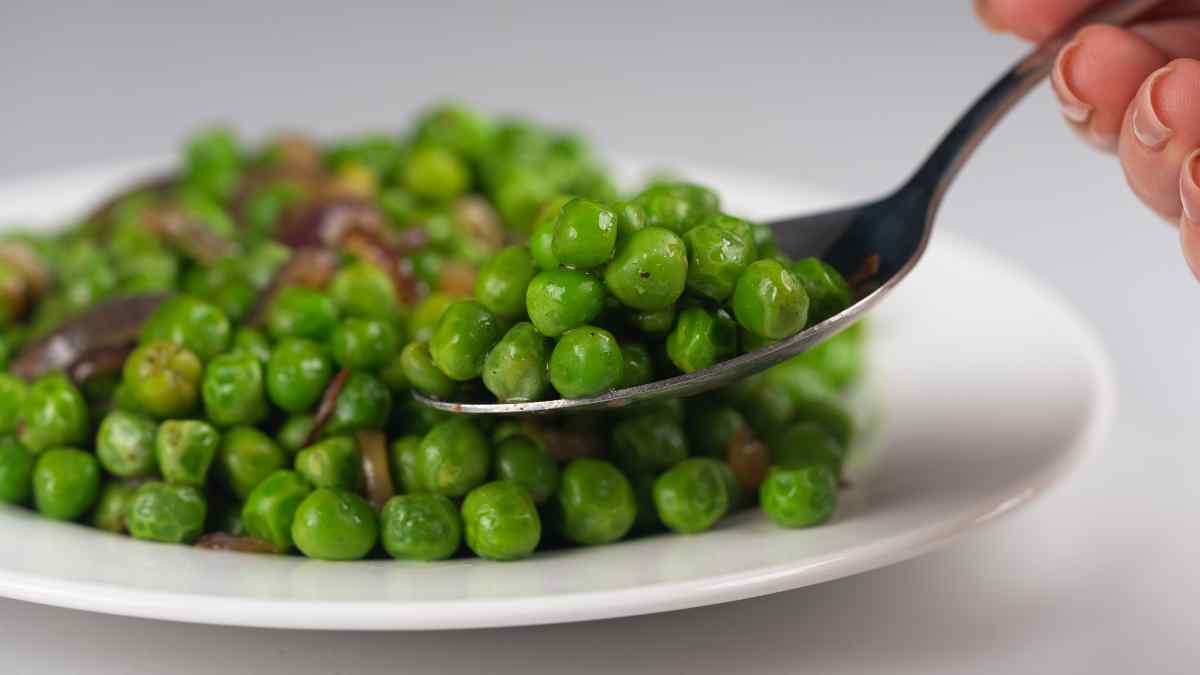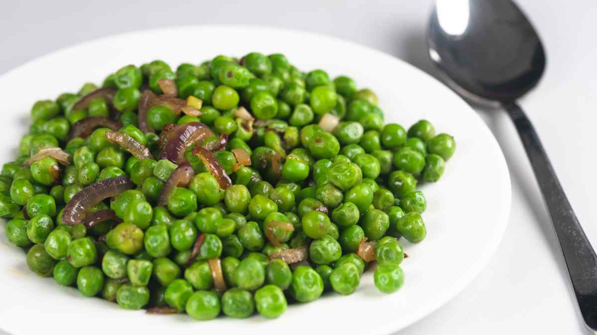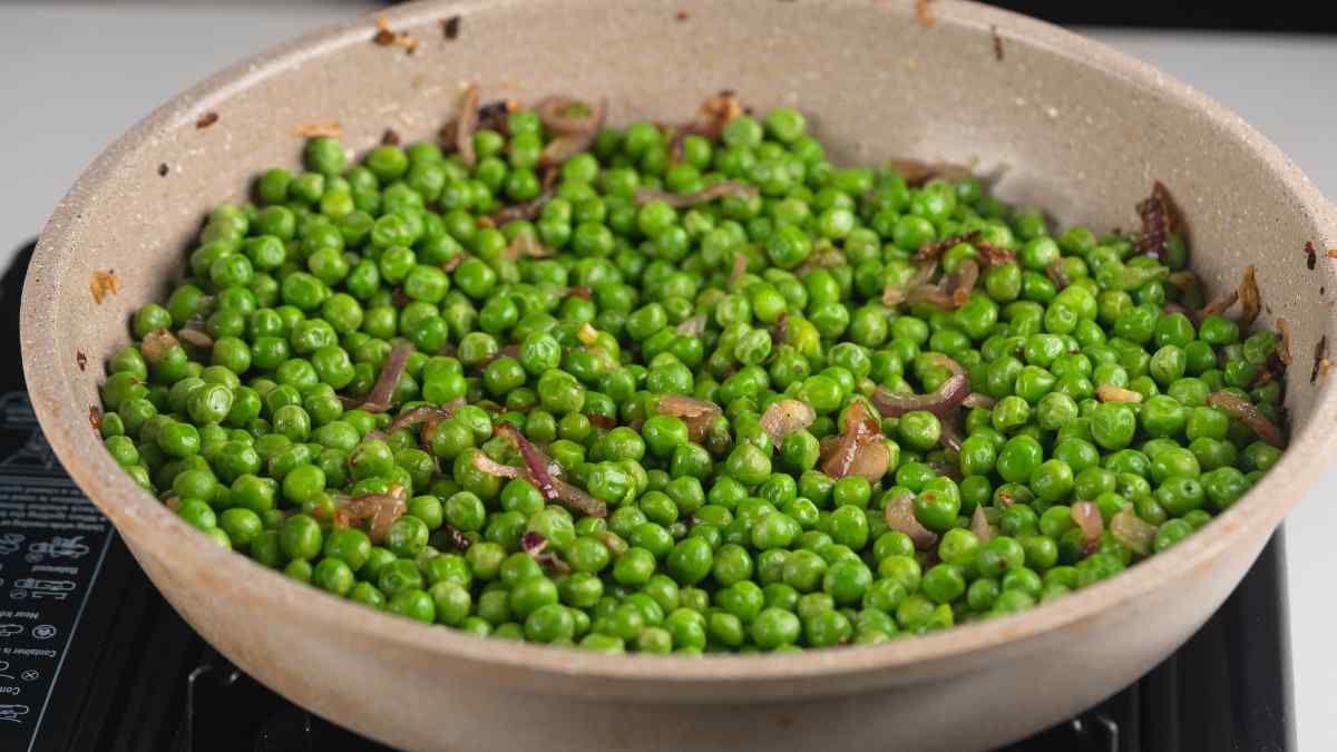 - 2 - 10oz boxes frozen peas1 large red onion slicedextra virgin olive oil to cover the bottom of the skillet