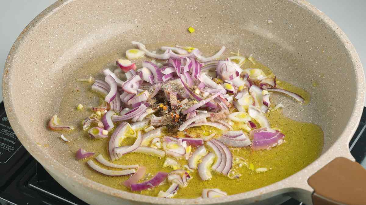 - Cover the bottom of the skillet with olive oil and sauté the onion, add the salt, pepper, and red pepper flakes. Cook till onion is translucent.