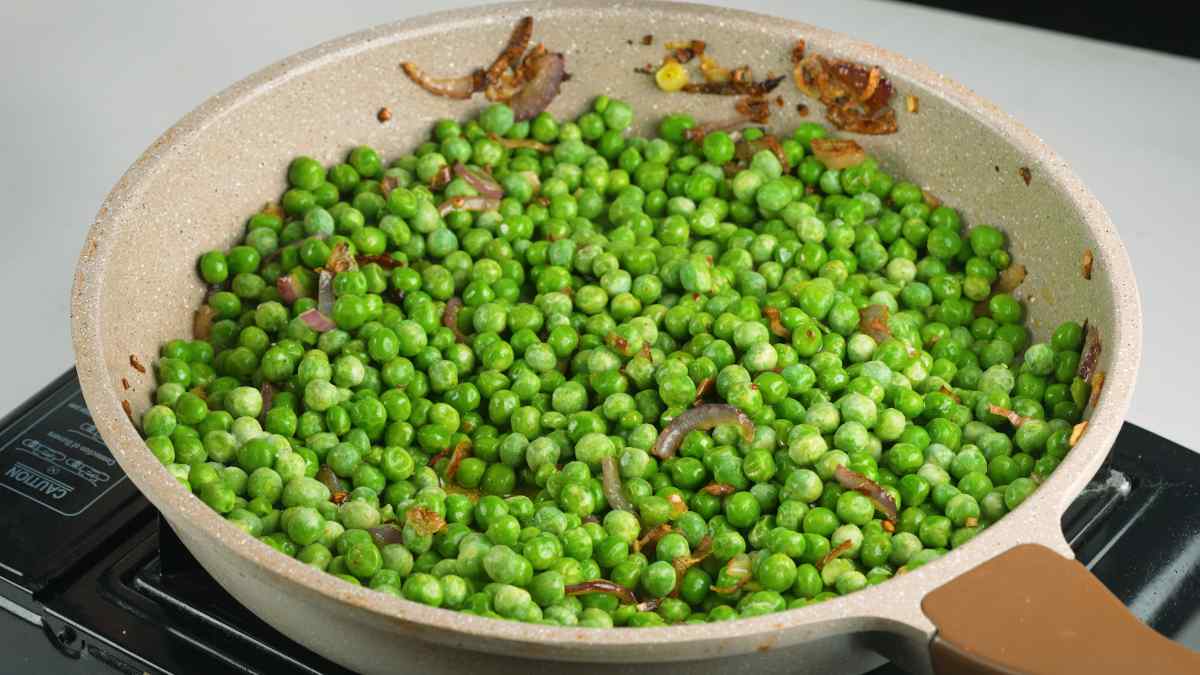 - Add the frozen peas. Sprinkle with salt and pepper. Drizzle with olive oil.