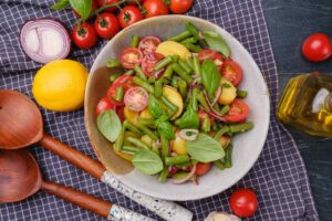 5. Place the string beans, potatoes, tomatoes, and onion on a large platter with a lip (to catch the juices) or a large bowl.