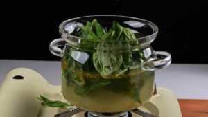 2. Cover the bottom of a large stock pot with olive oil. Add the salt, pepper, red pepper flakes and chopped garlic. Heat till garlic is golden.