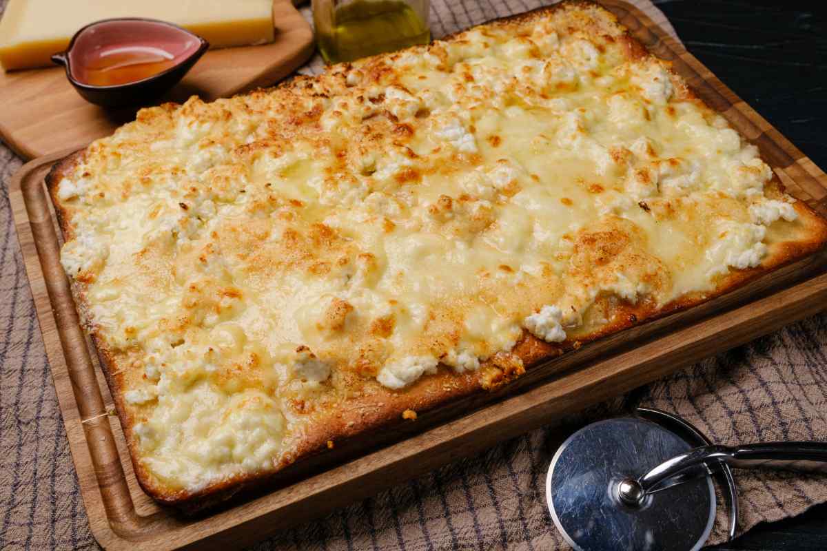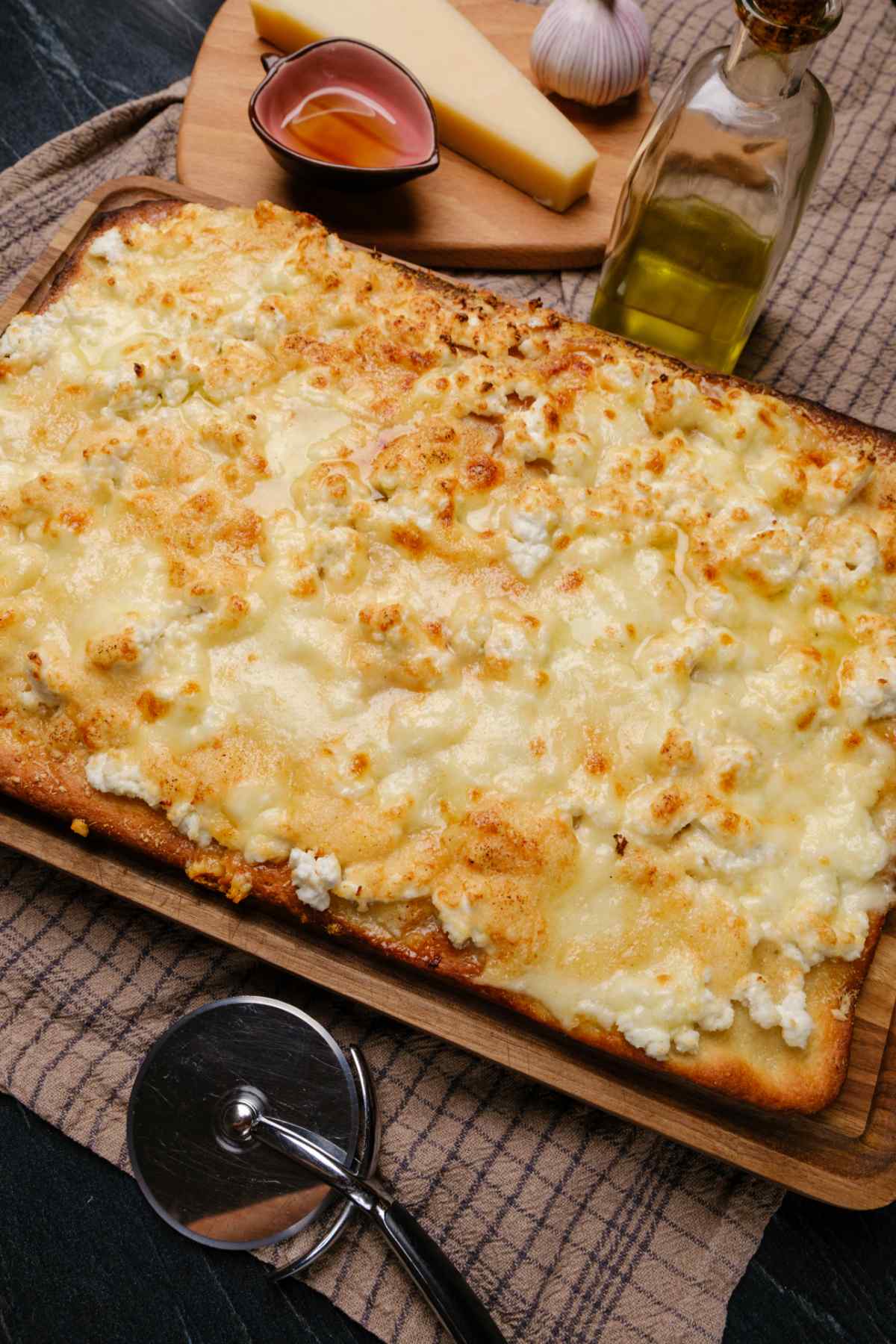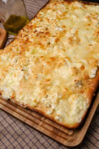 The white pizza originated in New York, it’s a nice way to change up the traditional tomato sauce pizza. The cheeses are rich and creamy and taste delicious with extra garlic. Serve with a side salad for a complete meal.